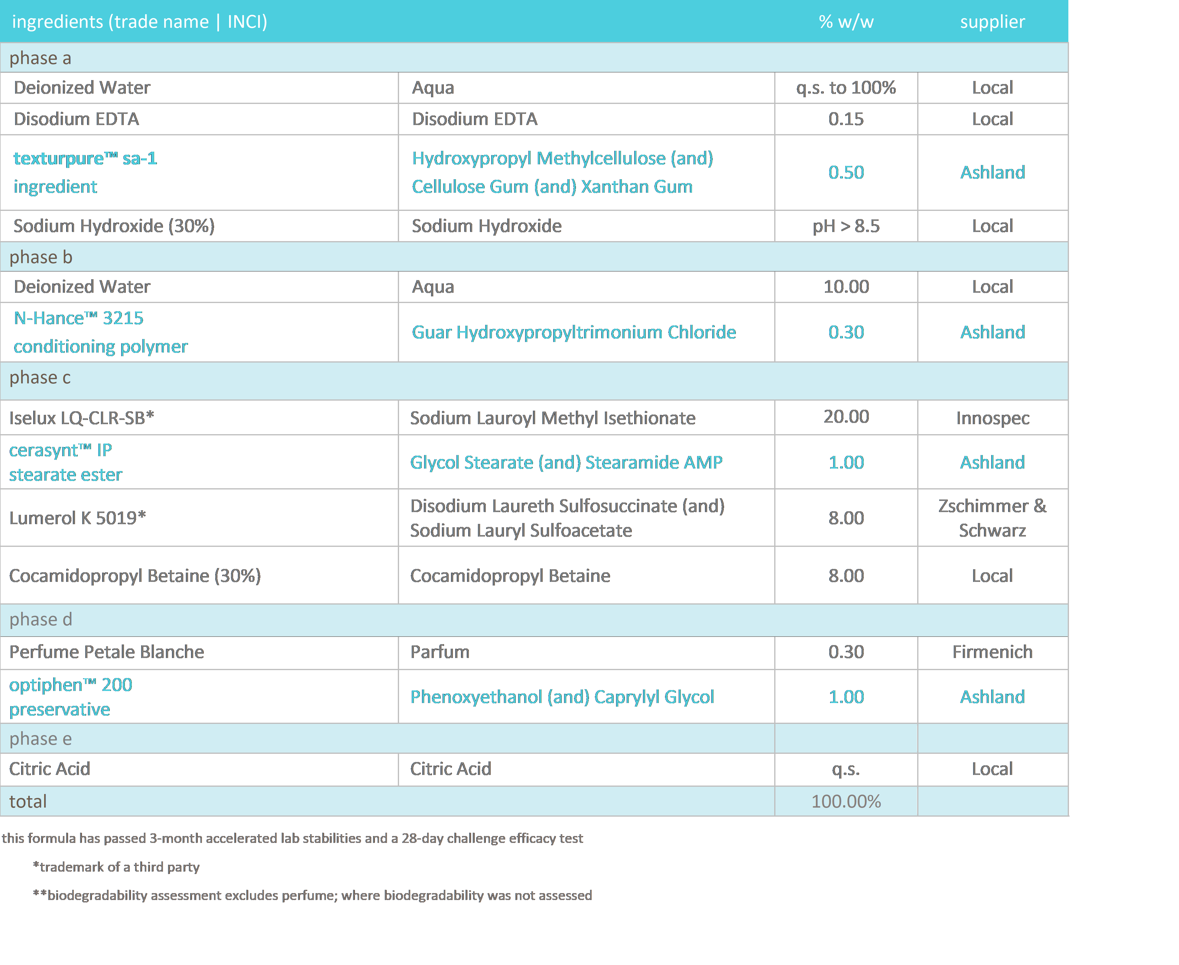 This inspired our solvers at Ashland to develop texturpure™ sa-1 our new and novel sustainable ingredient to deliver a rich smooth and luxuriously viscous texture with a clean break on pouring and suspension of oils and actives in shampoos and cleansing systems.