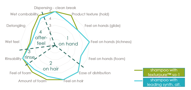 We tested multiple shampoos types where texturpure™ sa-1 was used side by side vs. the leading synthetic alternative rheology modifier-suspension agent (carbomer 980 at equivalent active levels). For example in our rich and caring sulfate-free shampoo – we tested in the salon and at home over the 4 key moments of truth for the consumer, and we discovered that texturpure™ sa-1 matches or is superior to its benchmark across the full sensory spectrum, graph 1:
