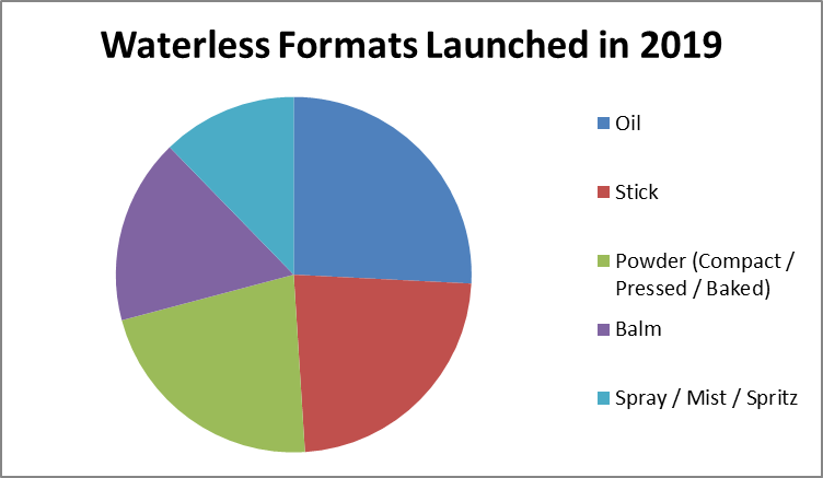 Further investigation shows that the majority of these waterless formats are oils, sticks and powders.