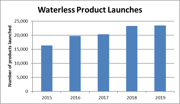 The number of waterless products launched in the Beauty and Personal Care category has increased over the last 5 years.